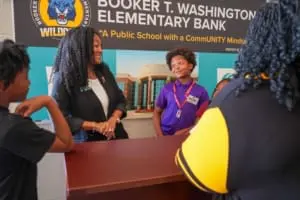A student acts as bank teller at the Booker T. Washington Elementary Bank
