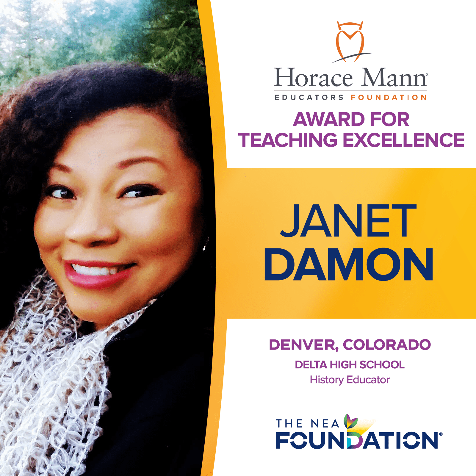 Janet Damon is a 9th-12th grade history/social studies educator at DELTA High School in Denver, CO. She is also one of the five educators receiving the 2026 Horace Mann Awards for Teaching Excellence.