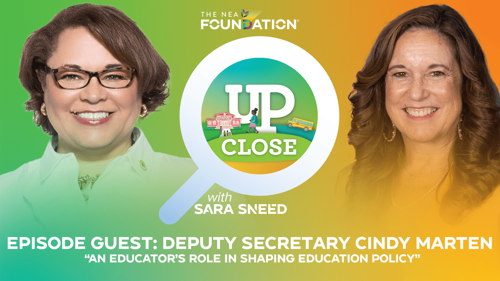 In the latest episode of the Up Close Podcast with Sara Sneed®, President and CEO of The NEA Foundation Sara A. Sneed sits down with Deputy Secretary of Education Cindy Marten to discuss her journey from a classroom teacher to one of the top education officials in the country. Throughout her 35-year career, Marten has championed equity in education, working to ensure every student and educator receives the support they need to thrive.