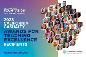 Washington, D.C. (October 4, 2022) — The NEA Foundation announced today that 46 public school educators from across the country will receive the prestigious California Casualty Awards for Teaching Excellence. These are educators nominated for their leadership, excellence in the classroom, family and community engagement, a commitment to equity and diversity, and advocacy for the teaching profession. This year’s awardees represent 45 states and a U.S. Department of Defense school abroad, reflecting the diversity of the teaching profession and diverse schools in urban, rural, and suburban communities.