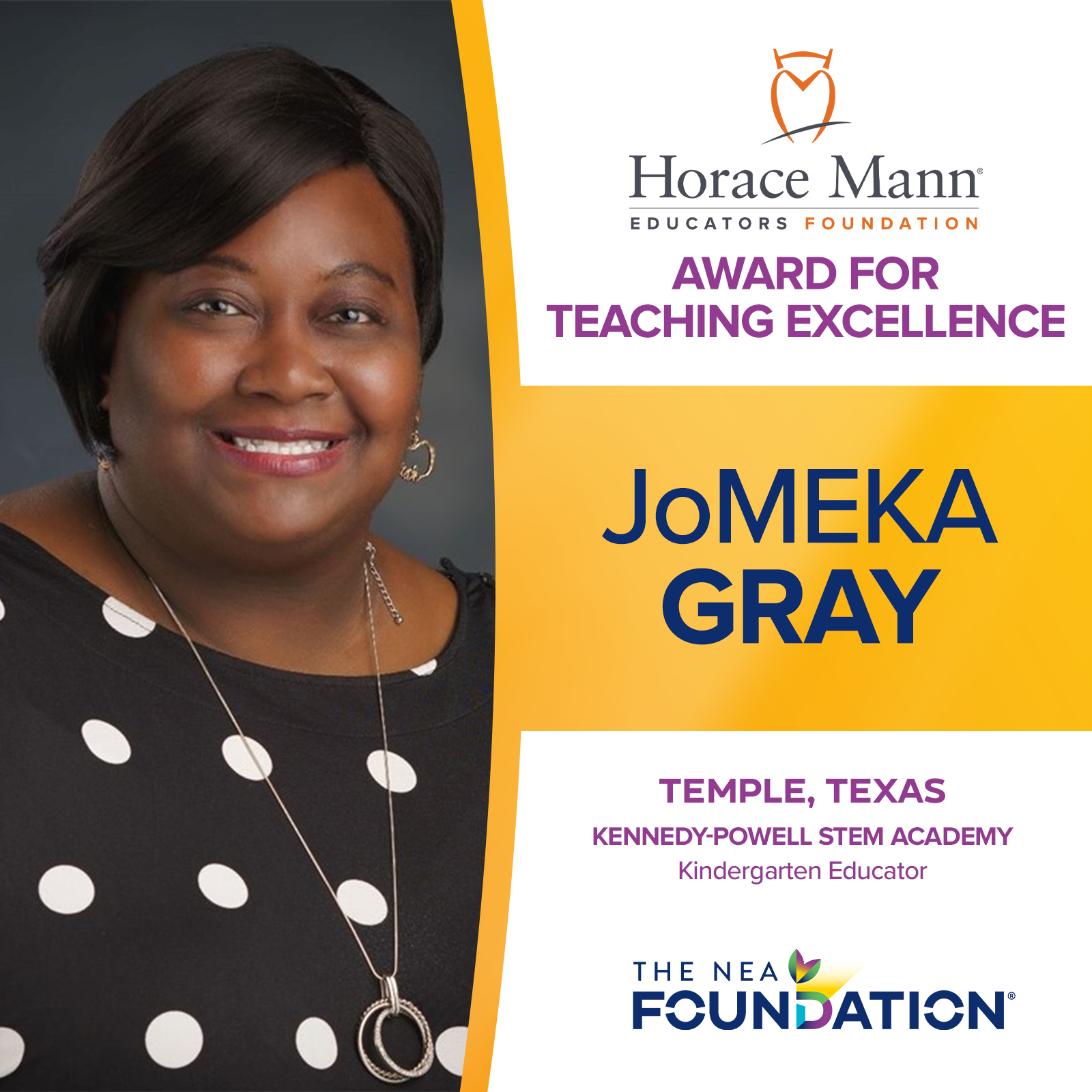 JoMeka Gray is a self-contained Kindergarten teacher at Kennedy-Powell STEM Elementary School in Temple, TX. She is also one of the five educators receiving the 2026 Horace Mann Awards for Teaching Excellence.